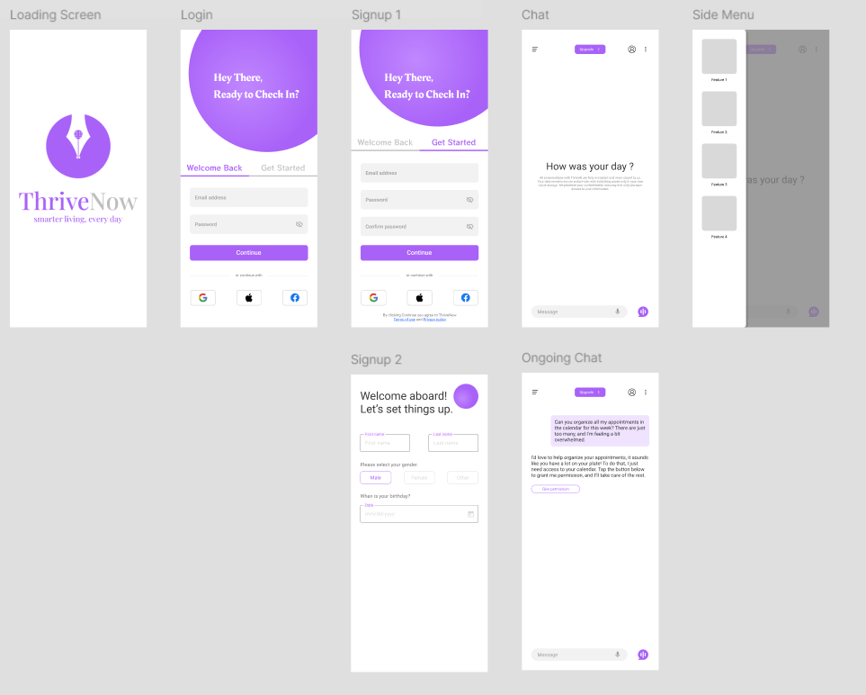 ThriveNow was founded by a group of students from UCL London as part of a startup competition organized by Brooklyn Investment Group. The concept centered around a journaling and stress management app powered by AI, designed to support mental well-being. The team successfully reached the second round of the competition. I was responsible for the logo design, full visual branding, and the UI/UX design of the application, focusing on creating a calm, intuitive, and modern user experience that aligned with the product's mission.